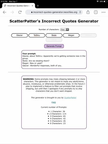 In the future i plan to implement a feature to filter out prompts that involve shipping . Some prompts may imply shipping between 2 or more characters. The generator used to create the scenarios is here: . Hab nochmal mit scatterpatter's incorrect quotes generator gespielt. There will be ships in this book.